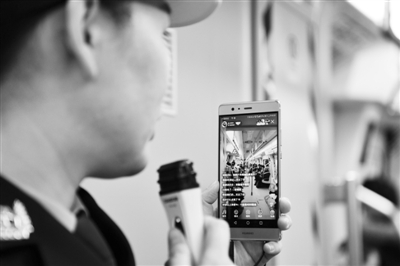 图为民警在天津地铁6号线“文明交通号”主题专列上用直播的形式介绍交通安全知识。