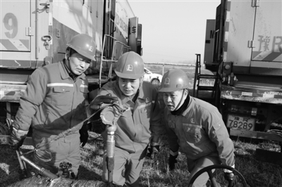 12月12日,在中石化河南油田LJ710井场,河南油服中心特车大队注氮队队长杨湖滨(中)和该队1200-1车组员工一起落实安全生产措施,为车组顺利投入注氮生产创造条件。
