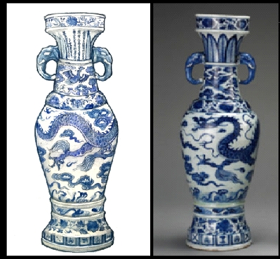 大维德花瓶器型复杂形体大,共有四爪云龙、缠枝牡丹和覆莲杂宝等八层纹饰。花瓶上的题记清楚地告诉我们,一位叫张文进的男子将这一对花瓶和一樽香炉供奉给一间道观,以祈求合家平安。也正是这一题记,大维德花瓶被确定为元代至正十一年(1351年)之真品,一改此前元代无青花的观念。因宋元鲜有青花记载,致使后人误以为明代首创青花。可见大维徳花瓶为元青花的断代标准。