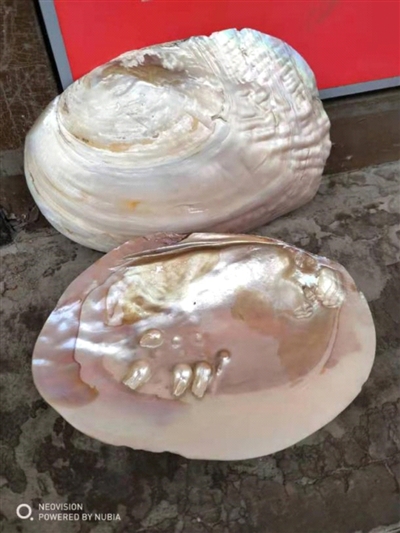 爱屋及乌,我收藏的珍珠贝壳,为扇形,上下两片。壳长13厘米,扇幅20厘米。壳蝶铰线直,两端有翼扰突出,大小约12.5厘米,上下壳光滑且有辐射肋。肋呈鳞状或瘤突状,壳内色有红、紫、橙、黄到白,更为可贵的是,壳内附着有7颗小圆珍珠和一个人形样不规则珍珠。