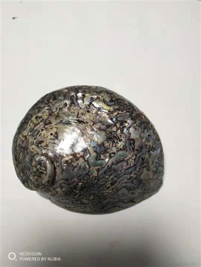 鲍鱼通常生长在水温较低的海底,足迹遍及太平洋、大西洋和印度洋,公认最佳产地为日本北部和墨西哥。我国东北部也是传统产区,以渤海湾出产的皱纹盘鲍和东南沿海的杂色鲍最为常见。鲍鱼的贝壳,是一个右旋的单壁螺形,好似人的耳朵,所以也被称之“海耳”。从顶壳向腹面排列有逐渐增大的一列螺旋突起,这些凸起在靠近螺层末端的一些贯穿成孔,孔数随种类不同而异。我收藏的那个有九孔,是“九孔螺”,产于中国北方。鲍鱼生长比较慢,一年为2~3厘米,壳长10厘米以上,大约六七年。我收藏的鲍鱼壳16厘米,生长的时间应在十年以上。贝壳体大,说明宽大扁平的肉足很大。鲍鱼就是靠着这粗大的足和平展的跖面吸附于岩之上,爬行于礁棚和穴洞之中。有资料介绍,壳长到15厘米的鲍鱼,其足的吸着力高达200公斤。怪不得狂风巨浪袭击,也不能将其掀翻捲跑。