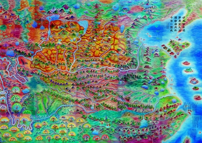1997年秋,我撰写出《山海经地理复原图注》,对《五藏山经》的地理方位进行了全面的文献考证。与此同时,孙晓琴根据我对《五藏山经》的地理方位考证,与我不断探讨和争论如何用绘画艺术的手段复原再现《山海经》时代的山川地貌景观和人文活动场景,开始了新的艺术创作历程,并绘制出20幅《山海经艺术地理复原图》组画。这种艺术上的探索,诞生出一种全新的艺术地图绘画形式,其艺术的无穷魅力植根于深厚的文化内涵之中。(上)