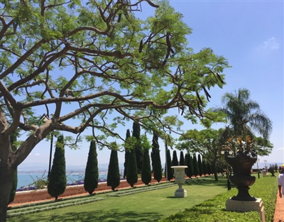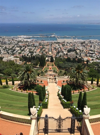 站在巴哈伊花园可以看到整个海法市。在一片戈壁之上,以色列人建成了这座花园城市。在这个绿意盎然的空中花园里,每一处花草、树木都是由以色列农业的科技成果——滴灌所养护。基督教、伊斯兰教、巴哈伊教在这里和谐相处。巴哈伊空中花园的围墙上,有着傲视群雄的鹰,它好像在观察着海法,也守护着。