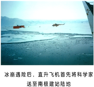 | 冰崩遇险后,直升机首先将科学家送至南极建站陆地。 |