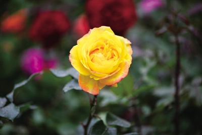 每年一到5月,北京道路绿化带里便开满了各色现代月季,形成绵延数十千米的花带,十分壮观。光谱是其中最常见的一个品种,它最有特色的地方是花朵颜色随时间而变化:初开时黄色,然后略着红晕;中期红晕加深,面积逐渐增多;后期整体呈现为朱红色。因此一棵月季上可以同时出现几种不同颜色的花朵,深受人们喜爱。