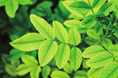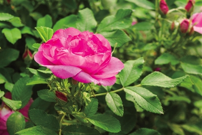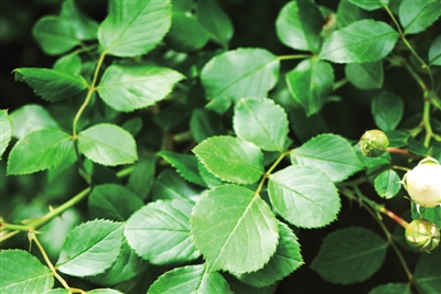 玫瑰:花单瓣或重瓣,多为玫红色(偶有白色);花期短,只开一季。羽状复叶,小叶5~9枚,多褶皱,无光泽。茎有刺,小而密。