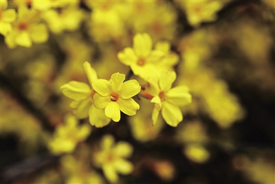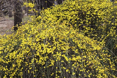 迎春因在百花之中开花较早,花后即迎来百花齐放的春天而得名。迎春初开之时只有零星的几朵小黄花,但很快便是成千上万朵金黄色的小花一同绽放,缀满细长低垂的枝条,仿佛是黄色的瀑布,在万物凋敝的北方显得格外明媚灿烂,给人无限生机和春意。