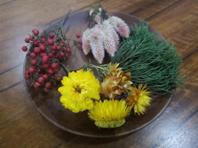 爬山虎藤、圆柏小枝、干果干花(南天竹果、蜡菊、野鸡冠花)。也可以选用家里的其他材料,如各种干花,棉花球、冬青果、松果等,尽量废物利用。