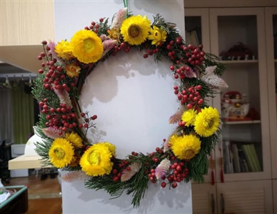 ⑤插上主角焦点花:将金黄色的蜡菊有主次地插入花环之中,可用热熔胶固定一下,注意安全,差不多6~7朵即可。
