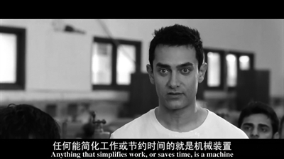 电影中,大学教授让学生给出对“机械”一词的概念解释。电影主角兰乔给出的解释是:“那些能节省人们精力和时间,简化人们工作的装置就是机械”。很显然,这个解释让教授很不满意,班上的“学霸”也对兰乔的描述很不屑。