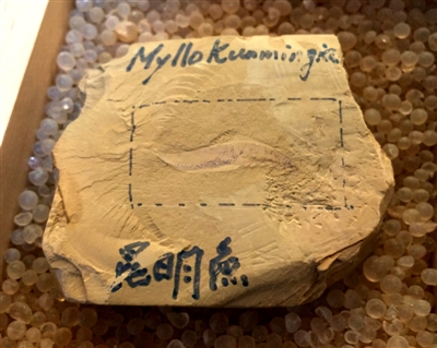 那我们人类的眼睛,和这些眼睛有关系吗?前面我们讲的都是无脊椎动物,人类是脊椎动物,脊椎动物的眼睛都是单眼,而不是复眼。虽然从基因这个层面看,脊椎动物和无脊椎动物的眼睛发育都与一些共同的基因密切相关,比如一种叫做Pax6的基因,但这两类动物是沿着不同的路径演化的。澄江动物群中发现的昆明鱼、海口鱼等,是最原始的脊椎动物,在它们的头部,也出现了一对椭圆形黑点,呈现单透镜结构。这对眼睛,才可以说是我们脊椎动物眼睛的演化起点。