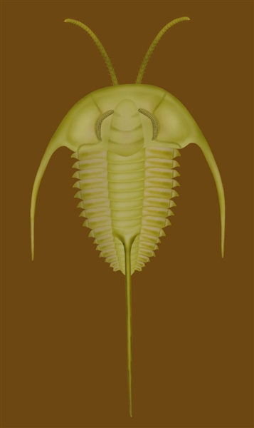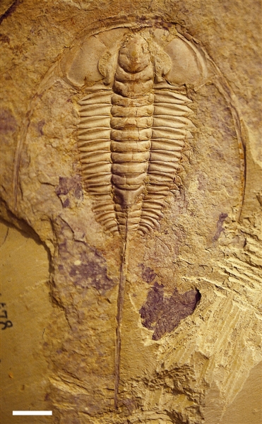 在我国云南的澄江地区,埋藏着距今5亿多年前的寒武纪早期化石,那时候,许多动物都已经有了真正的眼睛。比如当时特别繁盛的三叶虫类,(图1)这只三叶虫叫始莱德利基虫,在头部我们可以看到它的眼睛,这是一种形态十分奇特的棒状复眼,由一个一个的单眼组成,每个单眼都是由透明的方解石晶体构成的,它看到的景象应该类似于我们透过万花筒看到的景象。