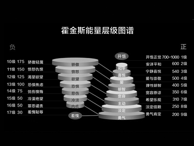 | “霍金斯能量层级图谱”,是由美国著名心理学家、精神医学博士、哲学博士大卫·霍金斯通过实验研究以及20年的临床实验,发现人类各种不同的意识层次都有其相应的能量指数,并且将这些能量指数大致划分了17级。 |