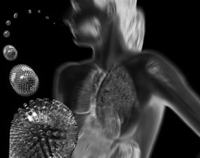 如果把流感病毒放大,我们就会像看科幻电影那样,体验到流感病毒“劫持”人体细胞的惊险过程。流感病毒的样子就像一颗水雷:一个圆球上面插着许多小棍。圆球是脂质膜包裹着的病毒的遗传物质。插在膜上的小棍,仔细看有两种:数目较多、看上去像柱子的是一种叫血凝素(简称HA)的蛋白质;数目较少、看上去像蘑菇的是另一种叫神经氨酸酶(简称NA)的蛋白质。 流感病毒颗粒随着病人的一个喷嚏或咳嗽,喷发出来,被另一个人吸进去后,落在鼻腔、咽喉或肺部的上皮细胞上。上皮细胞表面有一种叫唾液酸的糖分子,它本来的作用是吸附水分,让细胞表面保持湿润。