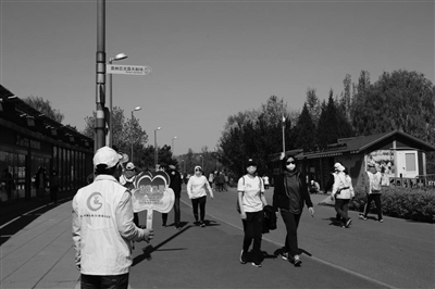 在奥林匹克森林公园我们看到,有50多名志愿者来到这里参加志愿服务。园区门口的志愿者们正在提醒游客按照一米间隔的安全距离有序排队入园。园区内的志愿者们一边维护园内环境,一边提示游客带好口罩,不要集聚,不要攀折花木。