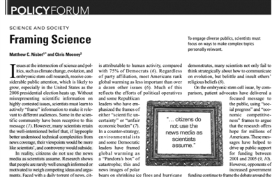 2007年,马修·奈斯比特(Matthew Nisbet)和克里斯·穆尼(Chris Mooney)在《科学》上发表了一篇评论,他们认为,科学家必须学会积极地为信息设置框架,以便让这些信息对不同受众具有相关性。并且通过设置框架可以与信息的核心价值产生共鸣,通过对某些方面加以强调可以精简某些复杂的议题,同时也可以让公民迅速地认识到为何某个议题很重要,谁应该对此负责,以及应该采取什么行动。