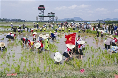 6月7日,在浙江省杭州市富阳区东洲街道红旗村的劳动教育实践基地,数百名中小学生与家长参加了趣味插秧和浑水摸鱼等活动,体验农事劳动。近年来,杭州市富阳区东洲街道红旗村致力打造农耕文化研学基地和新劳动教育基地,以寓教于乐的研学模式,让孩子们通过体验趣味农事活动,珍惜劳动成果。