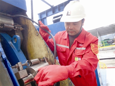 | 图为周克文检查钻机刹车系统。 |
