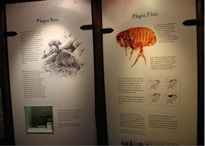 亚姆博物馆的瘟疫展览主要包括了两部分,一部分是有关本地历史和瘟疫的科普知识,另一部分则集中讲述了亚姆村与瘟疫抗争的故事。在展览形式上,主要借助一系列展板以文字和图像相结合的方式传递信息(图2),并通过场景再现还原当时患者感染瘟疫的痛苦情景。馆内还展出了大量的私人藏品,包括许多文件、照片和明信片记录了瘟疫年代的故事,不仅涉及瘟疫对亚姆村的影响,还涉及鼠疫和其他疾病在全世界的传播情况。