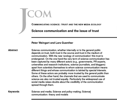 《科学传播期刊》(Journal of Science Communication)在2016年专门组织了一个专题,探讨科学传播中信任的问题。比如我们可以发现,很多人实际上并不直接地接触科学,而他们的科学信息绝大部分来源于各种媒介,或者说是从对科学进行的传播中来了解科学的,所有他们对渠道以及科学传播的信任会影响到他们对科学的信任,也就是说科学在媒介上的表征会影响到公众对科学形象的认知。提出了“科学媒体化”的概念的德国学者魏因加特等人甚至认为,科学传播实际上成为了一个场域,而不同的利益相关者会在这个场域里争夺注意力和科学传播的界定权。因为从某种程度上来说,获得了公众的关注就有助于获得信任,反之亦然。