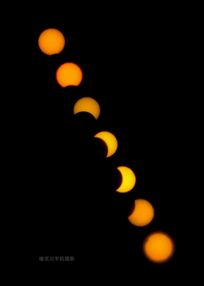 一直在考虑怎么拍这次北京日偏食,想到现在手机摄影非常火热,而且随着科技的进步,手机的拍摄能力越来越强,所以决定这次日偏食用手机来拍摄,也是一次新尝试。拍摄手机使用的是华为P30Pro,其拥有50倍变焦能力,可以将太阳视圆面拍的足够大。在拍摄过程中,不断地尝试相机的专业模式和自动模式间的不同用法,也颇有乐趣。值得注意的是,手机镜头前一定要加上减光镜,绝不能直接将相机对准太阳,否则强烈的阳光会损坏相机设备。我是把观日食用的观测眼镜贴在镜头前,充当减光膜,小型三脚架进行固定,拍出来效果还是很不错的。