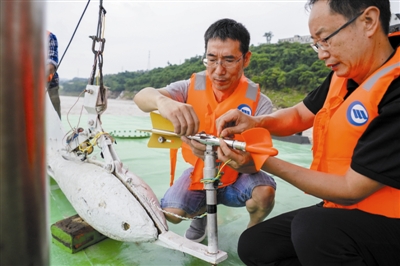 7月2日,“长江2020年第1号洪水”在长江上游形成。为及时掌握涪陵区长江重庆段的水文情况,长江清溪场水文站站长朱辉和同事一起,乘坐水文作业船前往水文站的作业面进行长江水文测量作业。长江进入汛期以来,这群长江水文“侦察兵”坚守在水文监测一线,及时准确上报辖区水情,保障人民群众生命财产安全。图为长江清溪场水文站站长朱辉(左)和同事将流速测量仪器安装在铅鱼上。 刘潺 摄