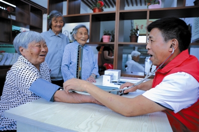 从2019年底开始,浙江省长兴县太湖街道开展了“党建+幸福驿站”活动,党员志愿者们通过在各村设立 “幸福驿站”活动中心,定期为老人服务,打造家门口的养老新模式,不断提升乡村老人的生活品质。图为党员志愿者给村里的老人们测量血压并普及日常养生知识。徐昱 摄