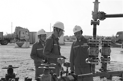 图为采油管理二区总监詹新(右一)在TK954H井检查井口放喷流程。涂红霞 摄
