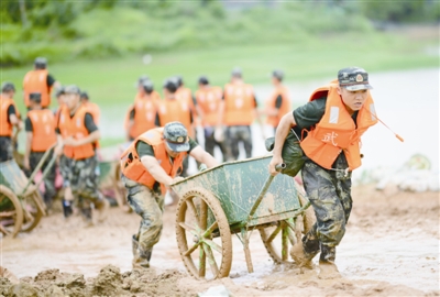 7月12日,受持续强降雨和上游来水叠加影响,7月12日零时,鄱阳湖水位突破有水文纪录以来的历史极值。武警江西总队500余名官兵坚守鄱阳县昌江圩堤坝一线处置险情。图为武警江西总队机动支队官兵在鄱阳县昌江圩利用推车运送沙袋。曹先训 摄