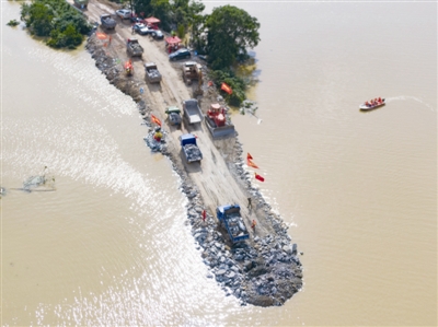 7月8日晚,江西省鄱阳县鄱阳镇问桂道圩堤发生漫决。险情发生后,中国安能第二工程局迅速调集抢险人员、工程装备前往决口现场,打响防汛抢险阻击战。截至7月12日下午,决口封堵进度已经过半。图为问桂道圩堤施工现场。 张浩波 摄