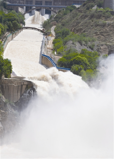 近日,受黄河上游强降雨影响,刘家峡水库入库水量持续增加。为减轻黄河主汛期防汛压力,降低水库水位,为汛期腾出更多防汛库容,刘家峡水库不断加大下泄水量,为平稳度汛提供有力保障。图为位于甘肃省临夏回族自治州境内的刘家峡水库溢洪道进行泄洪作业。 史有东 摄