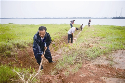 在洞庭湖中的“孤岛”澎湖潭垸大堤上,每天都有100多人拉网式巡查可能出现的险情。 巡堤的干部群众,分堤段排成一排,用手里的锄头、铁锹、镰刀清理杂草,缓慢地挪动着,锐利的目光扫过草丛、堤坡、沟塘,不放过任何可疑隐患。图为抗洪志愿者黄新田(左一)开挖沟渠。陈思汗 摄