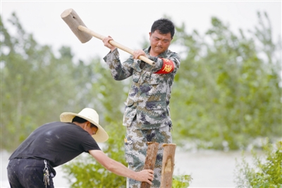 7月12日,在位于江西省九江市柴桑区江新洲的长江大堤上,洪棉雪站在水中,接过村民递来的一袋袋沙石,仔细地堵住渗漏。洪棉雪是江洲镇柳州村的村支书,今年45岁,负责江新洲长江大堤其中一段的巡堤守堤工作。江新洲四面环水,从7月3日开始,洪棉雪和村民们一直值守在圩堤上,一天3个班,一班8人,全天不间断巡堤,发现险情立即处置。图为江洲镇柳州村的村支书洪棉雪和村民一起打桩,加固堤坝。 彭昭之 摄