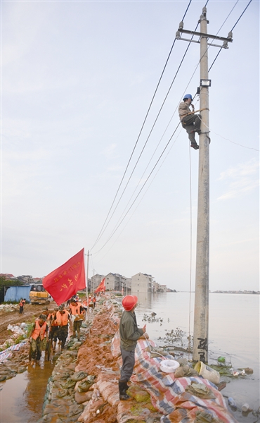 7月10日,江洲镇通过网络平台发出一封动员村民回乡支援抗洪抢险的“家书”后,数千名在外的江洲人纷纷响应,返乡抗洪。在九江经商的江洲镇团洲村村民方大贵说:“为家乡抗洪尽一份力,是我们义不容辞的责任。”越来越多的人加入抗洪巡守的队伍,凝聚起万众一心抗击“洪魔”的力量。图为工作人员在修理电缆(7月12日摄)。胡晨欢 摄