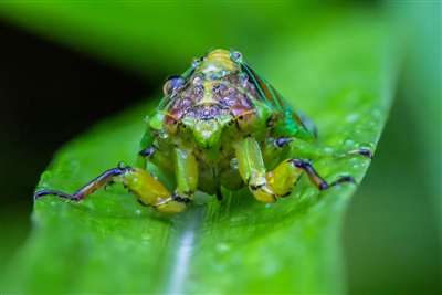 由于微距镜头的特性,景深特别小,前后才几个毫米,为了将蝉身上的水珠表达清晰,作者采用焦点堆栈的方式拍摄而成。
