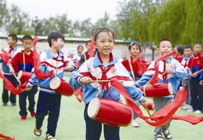 图为红寺堡中心小学学生在课后社团活动上练习腰鼓。
