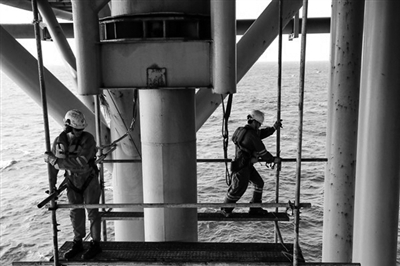 为保证安全,气田定期对该管线立管段进行防腐作业。此次作业期间,南海天气变幻不定,晴时浪高亦可达两米。施工人员克服了23米高空舷外作业存在的困难,在高中低3处守护点,依据潮汐规律紧抓风浪间歇,提前两天完成了所有预定作业内容。孙景克 摄