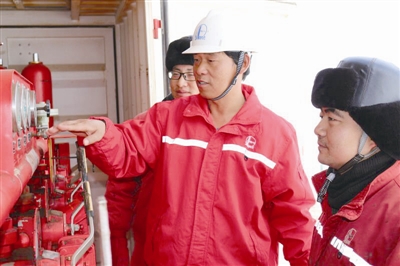 | 图为马爱军(中)带领工程师及平台副经理检查井控装置远控房。 |