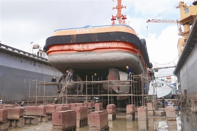 图为工人在船坞检修船只。豫黔 郭立刚 摄