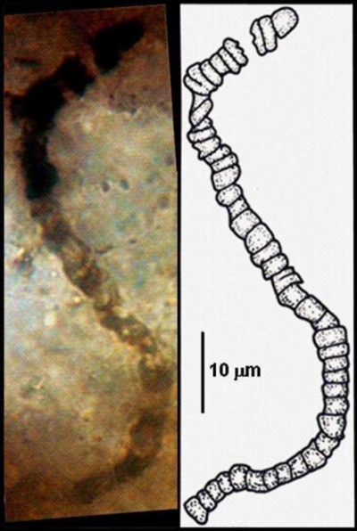 然而,神奇的是有一种叫蓝藻的生命,又称之为蓝细菌,早在距今35亿年前就已出现。科学家们在澳大利亚西部距今约35亿年的瓦拉伍纳(Warrawoona)群的硅质燧石中发现了形似丝状蓝细菌的微体化石。它们与现代蓝藻在形态上很相似,很可能是一类以太阳光为主要能源的自养生物。碳、硫同位素测试也表明,在该地质时期已经有蓝藻、还原硫细菌等生物构成的原始生物圈。