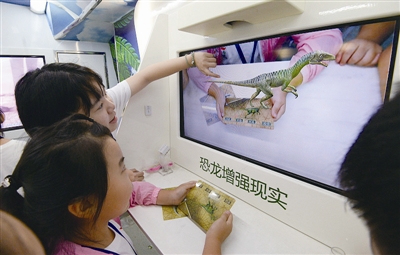 8月23日,河北邯郸,小朋友们在“流动科普车”上参观。