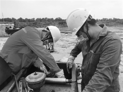 | 图为卢卫平(右)疫情期间协助员工修理注水泵。 |