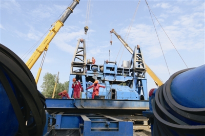 图为8月25日,该中心钻前工程大队员工在中原油田文65-侧83井安装钻井设备。陈英杰 摄