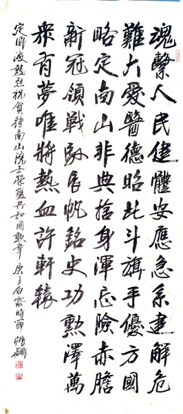魂系人民健体安,应急系建解危难。大爱医德昭北斗,旗手,优方国略定南山。非典舍身浑忘险,赤胆,新冠领战驭长帆。铭史功勋泽万众,有梦:唯将热血许轩辕。