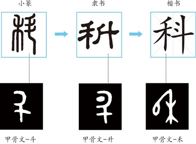 我国古代实行实物地租,农民收获谷物之后,需要交纳租税,交的时候需要用到斗和升这样的量器(“科”的隶书字形,右侧就是“升”),所以“科”的本义是用量器来称谷物。