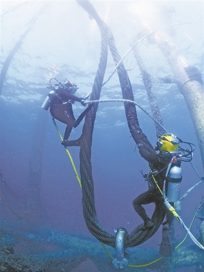 图为潜水员正在执行水下挂扣任务。黄一峰 摄