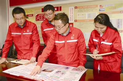 | 图为陈彪(右二)与技术人员正在研究处理DLK3井井下落鱼打捞方案。 |