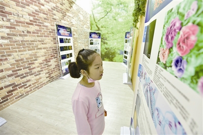 | 图为小朋友在合肥植物园科普馆里观看微距摄影大赛作品。 |