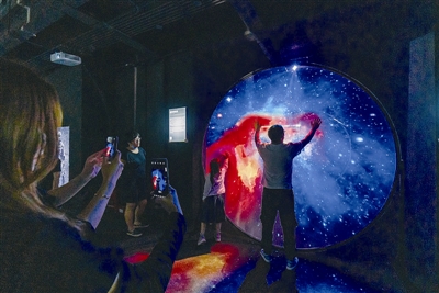 | 图为观众在上海陆家嘴嘴中心的“COSMOS平行宇宙”展览现场打卡拍照。据介绍,展项对多个著名的量子力学实验都有着独到的见解。 |