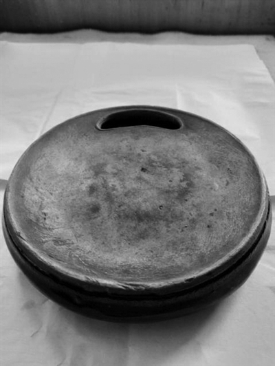 第一件,鼓形褐黑釉瓷暖砚。砚直径20cm,高5cm。砚身着褐黑色釉,光亮溫润。砚面砚底无釉。圆形砚堂稍外凸,开有半月形水口,腹中空。砚底圈足內深外浅,形似水盆。胎釉相接处见火石红。砚有使用过的岁月感。砚腹可注热水,以保障寒冬里砚堂墨液不冻结冰。有很强的实用性和感人的暧心关怀。
